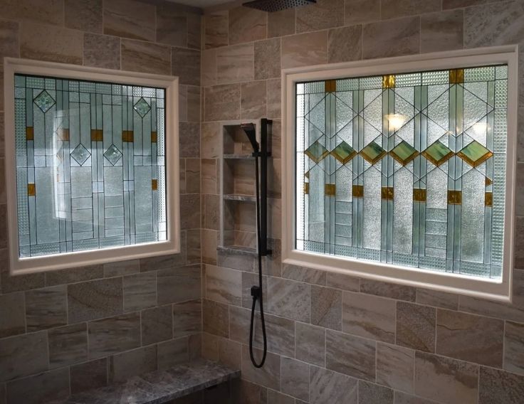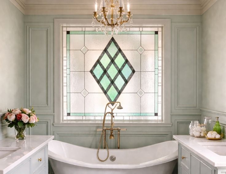 Our custom stained glass bathroom windows are designed to add privacy, elegance, and timeless charm. Perfect for shower spaces, spa-like retreats, or soaking tubs, these pieces diffuse light beautifully while maintaining privacy.